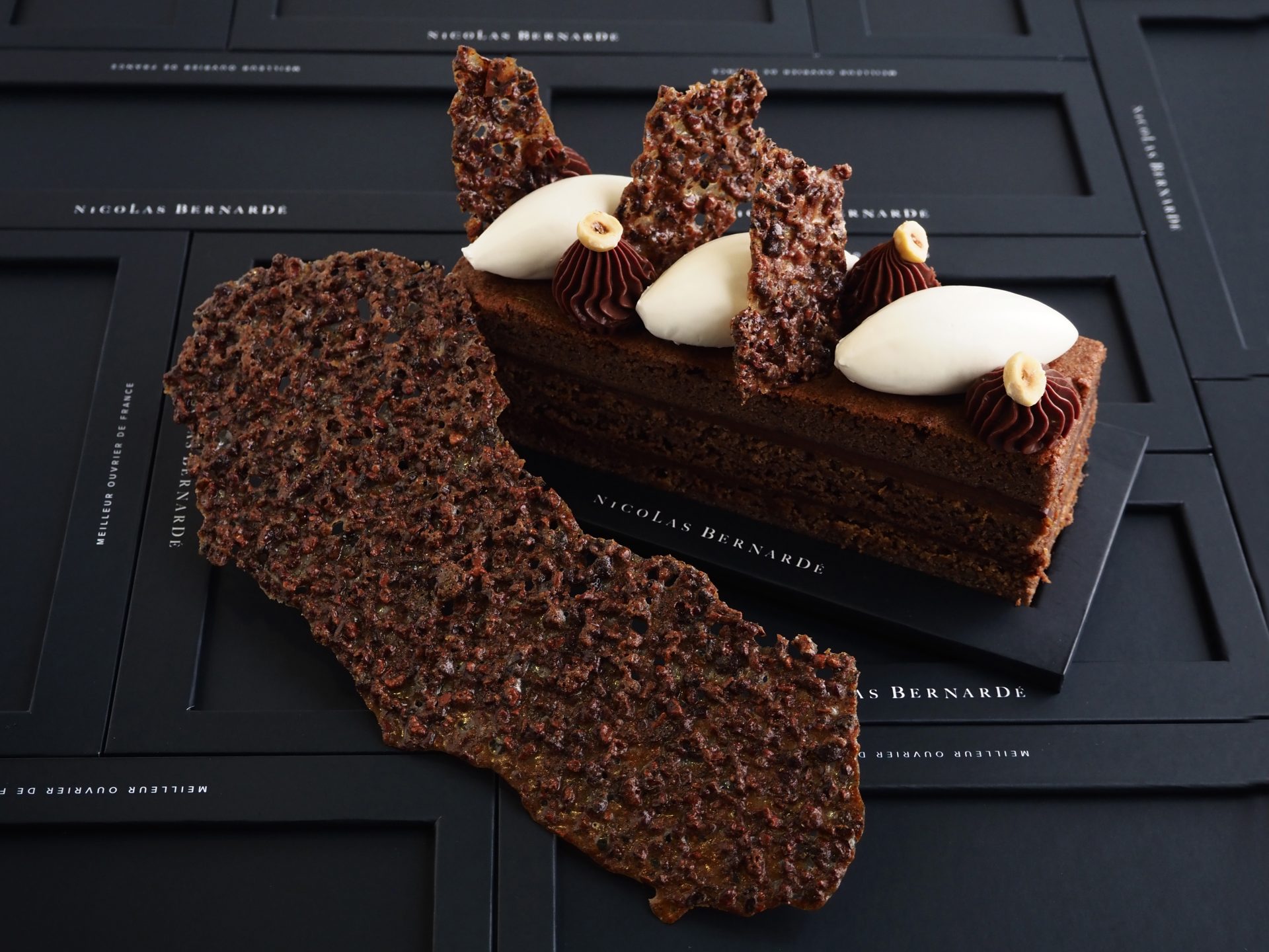 Le gâteau se compose d’un biscuit ultra moelleux garni de ganache fondante, tous deux préparés à base de chocolat de Saint Domingue, réputé pour son arôme intense et corsé. Et pour sublimer ces belles saveurs de chocolat, des touches de crème vanillée, des fleurs croustillantes aux noisettes et des pétales de nougatine au grué de cacao viennent apporter leurs textures croquantes et bien crémeuses dans un joli décor gourmand. Une merveille !