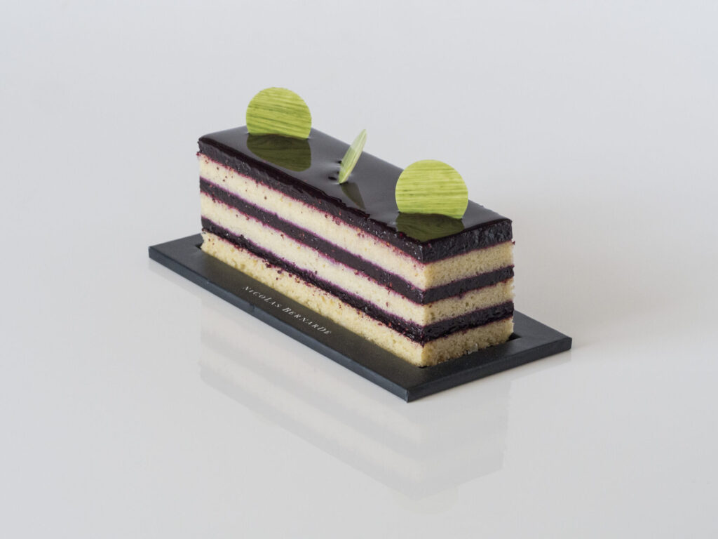 Entre deux plaques de pâte feuilletée bien croustillante, découvrez la douceur gourmande d’une crème diplomate à la pistache accompagnée d’un exquis crémeux à la vanille. Dessus, dans un graphisme magnifiquement agencé, des lignes de poudre de pistache contrastent un parterre de sucre glace immaculé et parsemé de quelques notes croquantes de pistaches entières. Sublime et délicieux !