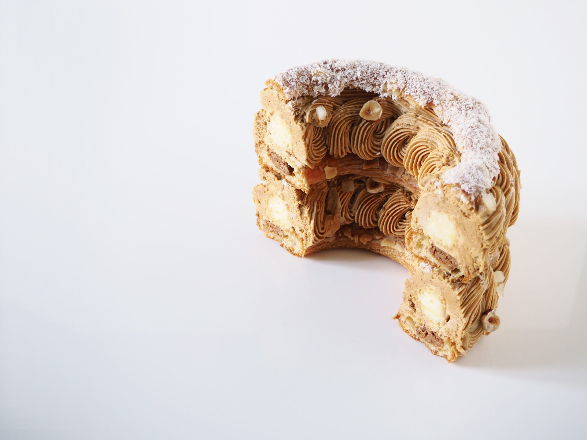 Tout commence par une base moelleuse de pâte à choux nappée de croustillant à la noix de coco et de mousseline fondante au praliné. Puis, posés dessus, des éclairs bien dodus sont garnis d’un crémeux citron au délicieux parfum de méditerrannée. Enfin, recouvert de crème au praliné joliment torsadée, le Paris-Brest se coiffe d’une dernière couronne de pâte à choux ponctuée de noisettes et de cubes de citron pétillants.