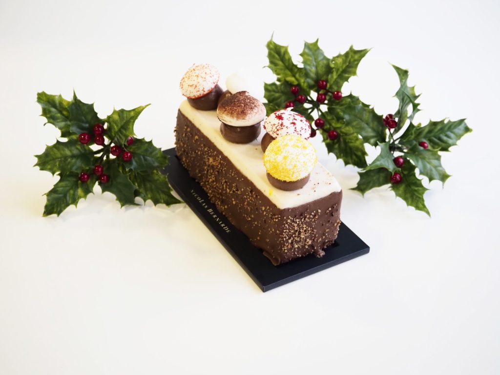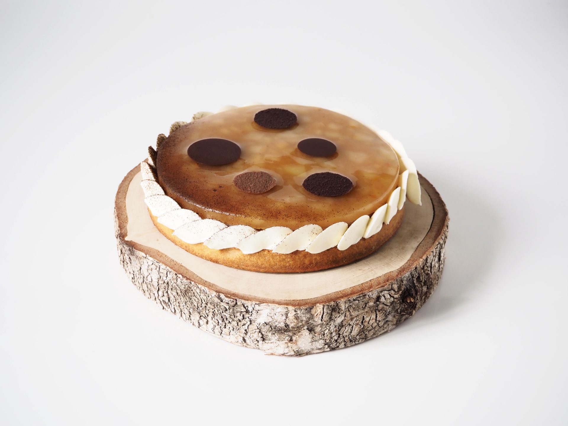 Sur une fine pâte sucrée, vous découvrez une délicieuse crème d’amande et de chocolat agrémentée de petits cubes frais de poire. Ensuite, au cœur de la tarte, une mousse légère et un crémeux bien fondant, tous deux au chocolat, viennent superposer leurs arômes intenses de cacao comme une jolie surprise gourmande. Ils sont recouverts d’une magnifique compotée de poires garnie de petits morceaux de fruits rôtis aux parfums délicats et d’une belle couleur ambrée. Décorée d’un ruban de ganache et de quelques pastilles au chocolat, cette succulente tarte d’hiver parfaitement équilibrée est à fondre de plaisir.