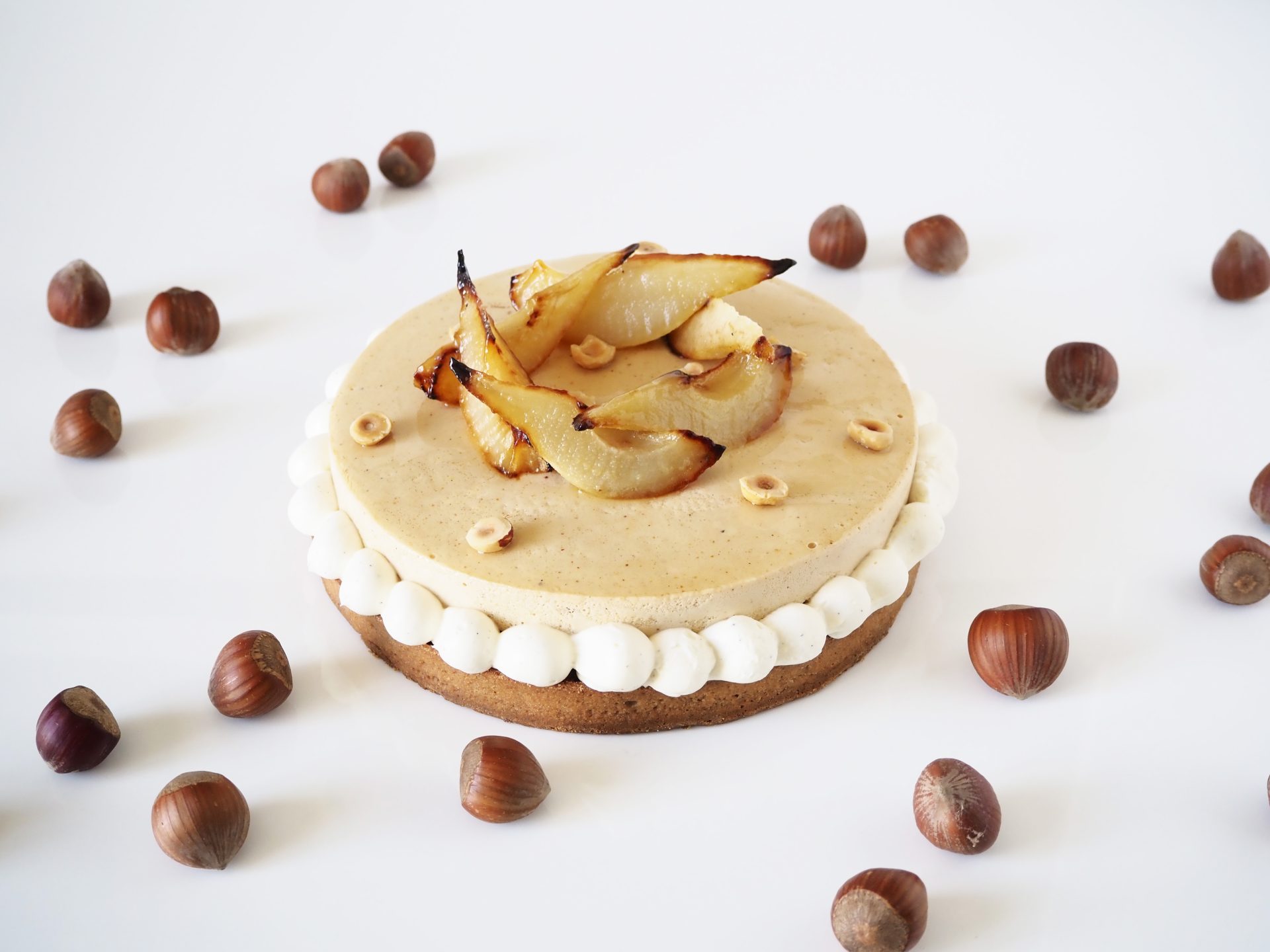 Cette jolie tarte se compose d’une pâte sucrée légèrement croustillante et d’un biscuit financier aux noisettes garni de noisettes entières. Nappée dessus, une compotée de poires révèle des arômes exquis comme une belle surprise fruitée au cœur de la tarte et se recouvre d’une mousse noisette aussi légère que gourmande. Un ruban de crème, quelques noisettes et des poires rôties viennent sublimer l’ensemble d’une dernière douceur parfumée. A déguster bien au chaud.