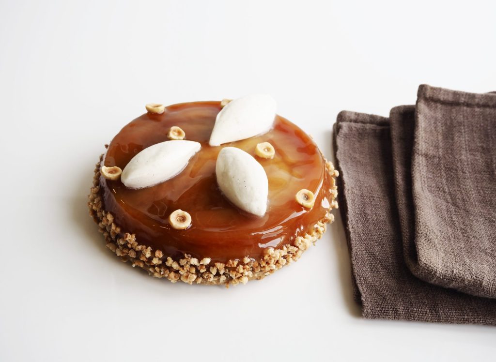 Cette jolie tarte se compose d’une pâte sucrée légèrement croustillante et d’un biscuit financier aux noisettes garni de noisettes entières. Nappée dessus, une compotée de poires révèle des arômes exquis comme une belle surprise fruitée au cœur de la tarte et se recouvre d’une mousse noisette aussi légère que gourmande. Un ruban de crème, quelques noisettes et des poires rôties viennent sublimer l’ensemble d’une dernière douceur parfumée. A déguster bien au chaud.